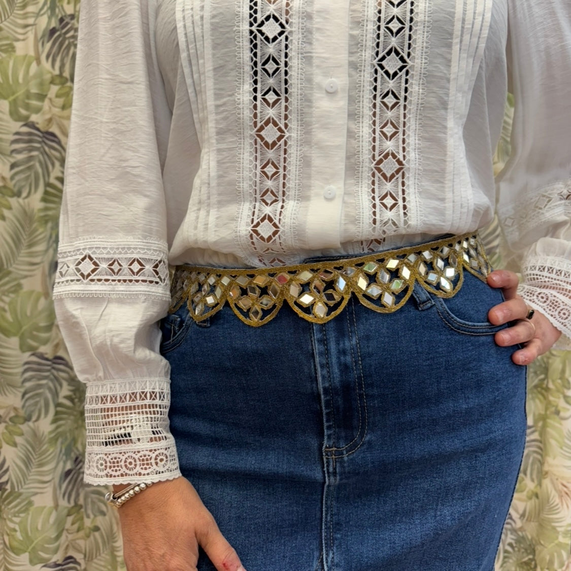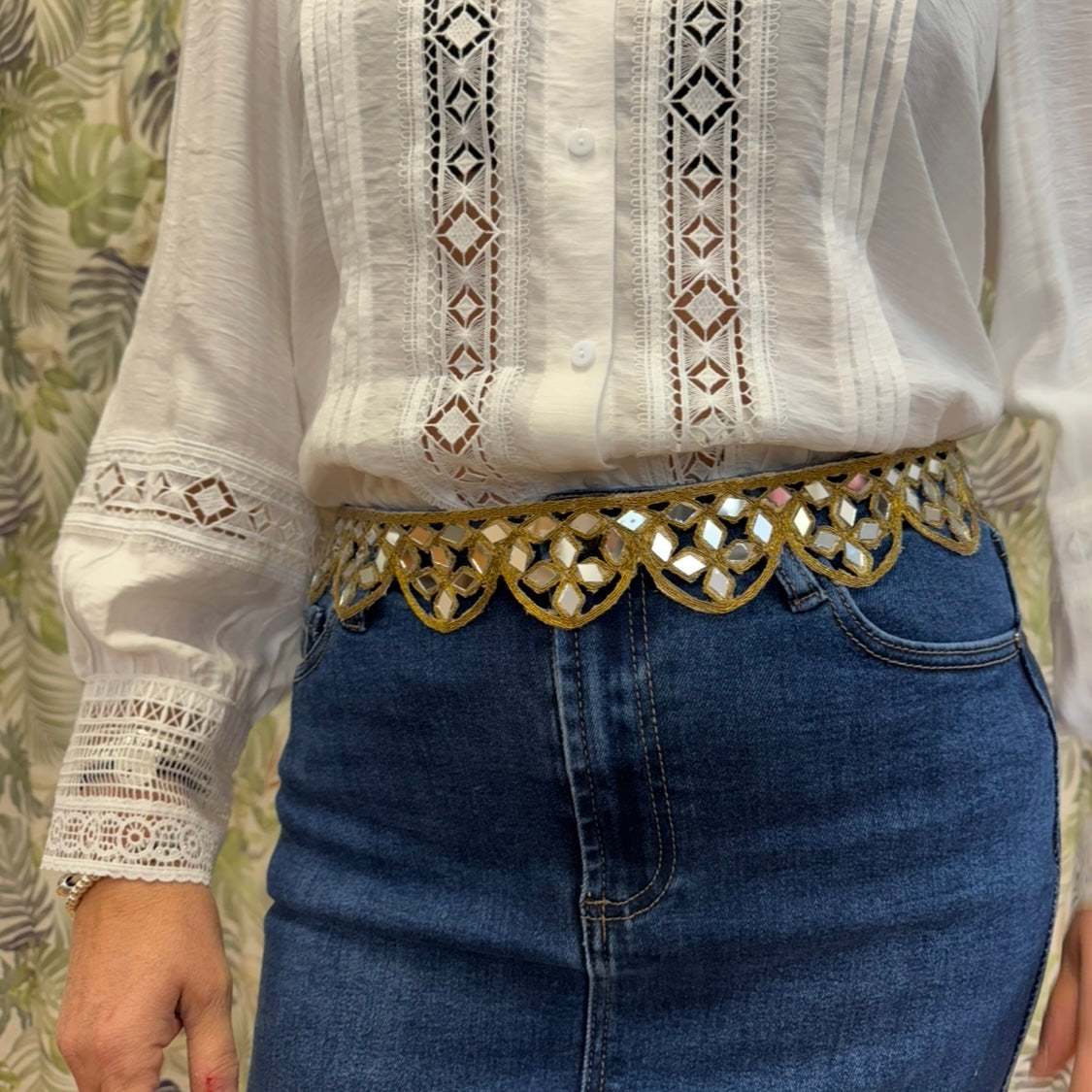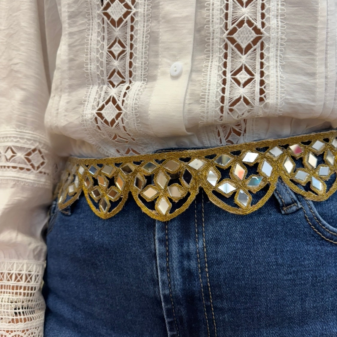 Su acabado dorado y los pequeños espejos reflejan la luz de manera elegante, aportando un aire sofisticado y bohemio a cualquier look. Ideal para combinar con vestidos vaporosos, blusas de encaje o jeans de tiro alto, este cinturón es el complemento perfecto para quienes buscan un toque de distinción y originalidad. ✨