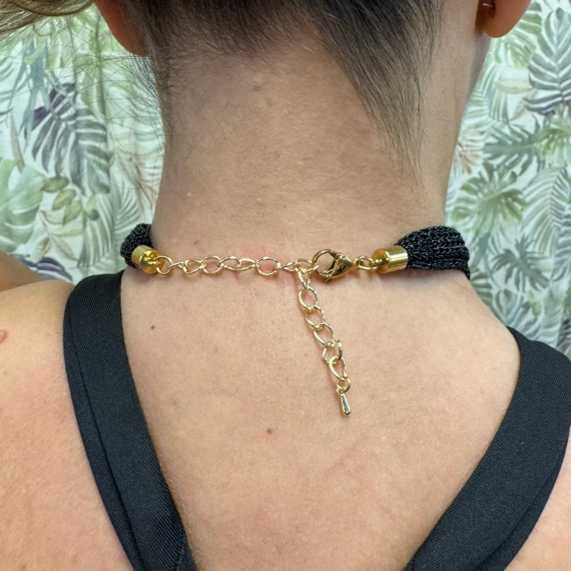 El collar "Noir" es pura intensidad y elegancia con un aire gótico chic. Su diseño tipo choker con malla negra y cruz de piedras oscuras lo convierte en una pieza poderosa, ideal para quienes buscan destacar con estilo y personalidad. Perfecto para looks de noche, vestidos escotados o conjuntos minimalistas, este accesorio añade un toque de misterio, fuerza y sofisticación. 🖤✨