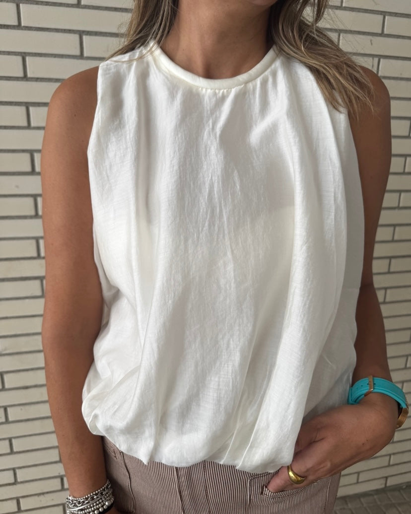 Top sin mangas confeccionado en una tela muy fluida, con un diseño tipo globo que aporta volumen y movimiento. Su caída ligera crea un efecto elegante y relajado, perfecto para combinar con pantalones ajustados, faldas lápiz o shorts para un look sofisticado pero cómodo. Ideal para lucir tanto de día como de noche, aportando un toque moderno y versátil a cualquier outfit.