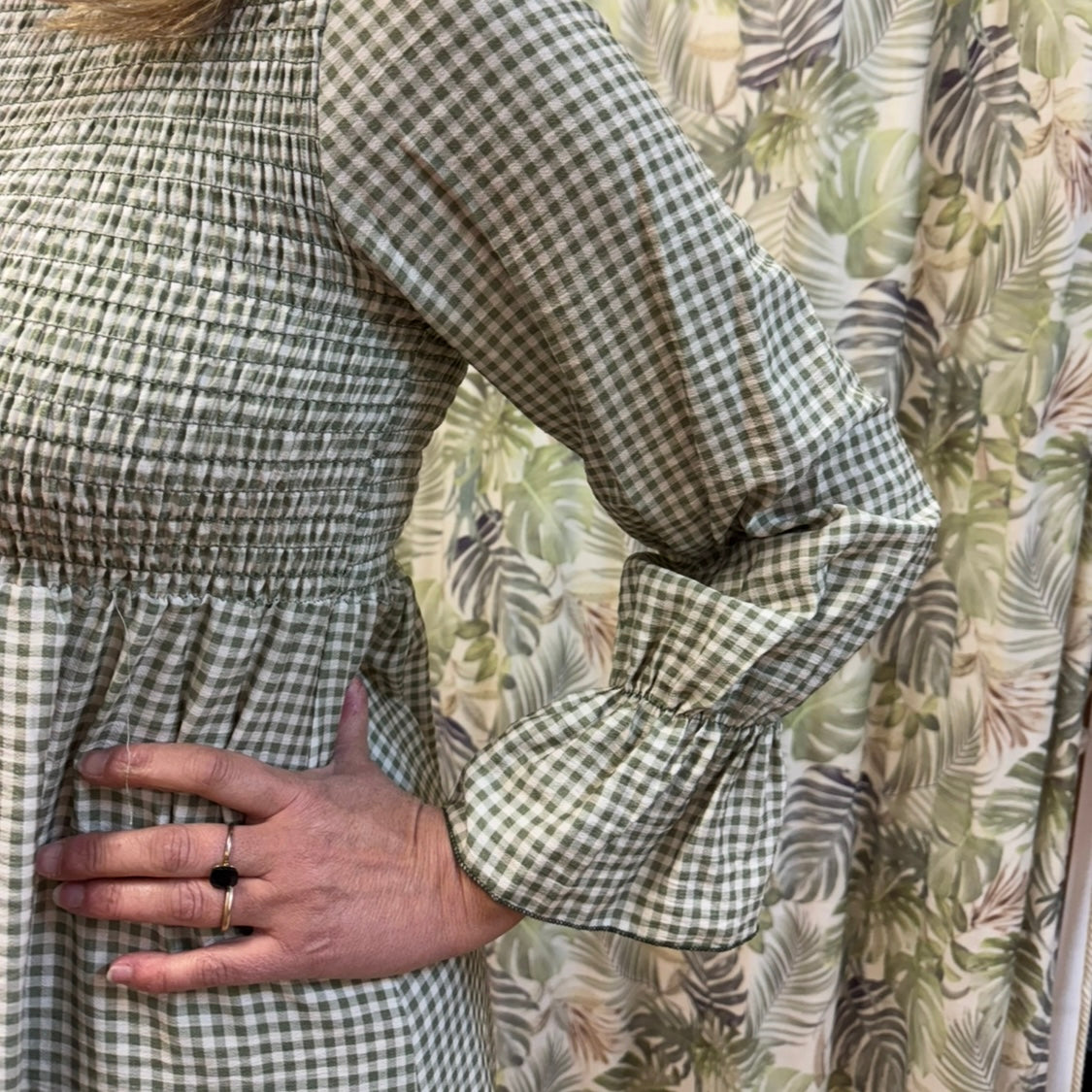 Romántico y con un aire campestre, el vestido Green Meadow destaca por su delicado estampado de cuadros vichy en tonos azul pastel. Su diseño de corte amplio con cuerpo fruncido, mangas abullonadas y detalles de volantes lo hacen perfecto para un look femenino y relajado. Ideal para combinar con botas o sandalias y brillar en cualquier ocasión.
